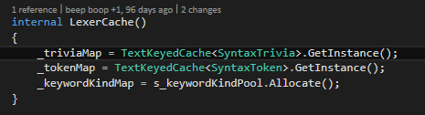 The lexer cache itself uses the TextKeyedCache under the hood. Figure 10 shows the constructor of the LexerCache class. There are 2 TextKeyedCaches. One for trivia and one for tokens. The lexer cache tries to find an already seen trivia or token in the underlying TextKeyedCache. If it does not find the item in the cache, it creates a new trivia or token an puts it into the cache. One could argue, that the LexerCache class is an unnecessary layer. I gave this feedback to the Roslyn team. And indeed, in a direct talk with the team, they admit that the LexerCache class is some kind of historical code. So don’t take me serious here, but maybe they will eliminate this class in later version and merge the functionality into the Lexer class.
