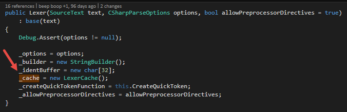 Let’s have a look into the lexer. Figure 9 shows the constructor. As you can see, the lexer creates a LexerCache instance. This is the cache for the specific lexer for one parsing process. It is used to caches tokens and trivia.