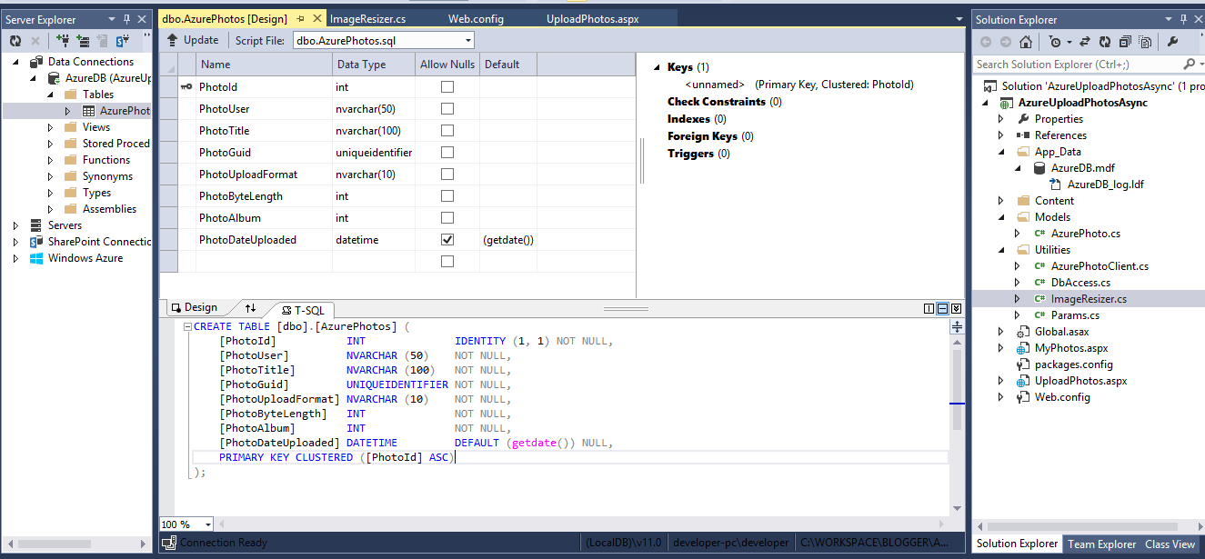 NOTE: http://127.0.0.1:10000/devstoreaccount1 is the emulator’s URI and ‘azurephotos’ is the blob’s container name we will create for storing our photos. As far the unique identifier for each image it’s a usual technice to keep file names private from public users. For each image we create a Guid value and store this value in an SQL Server database table with all relative photo information such as title, length, file upload format, user uploaded, album etc.. In my solution I created a localdb database named AzureDB and created the respective connection string in the web.config file. Use the following SQL code to create a table that will store the information needed for each photo uploaded: